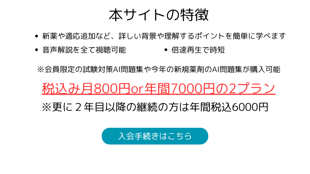 ※各薬剤の解説内容が多い為、パソコンではじっくり要約を読んで頂き、スマホでは音声で概要を理解して頂く勉強方法を推奨します。